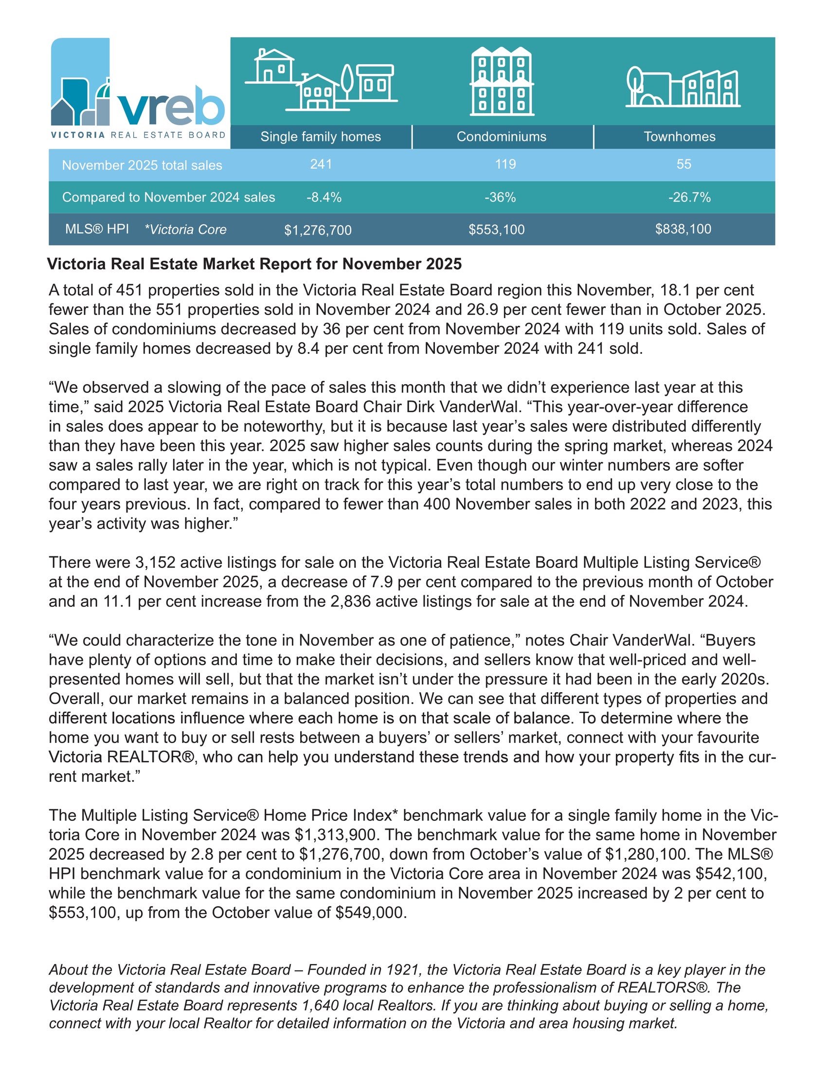 Summary: In November 2025, the benchmark price for single-family homes in the Victoria Core reached $1,276,700, reflecting a 8.4% year-over-year decrease.