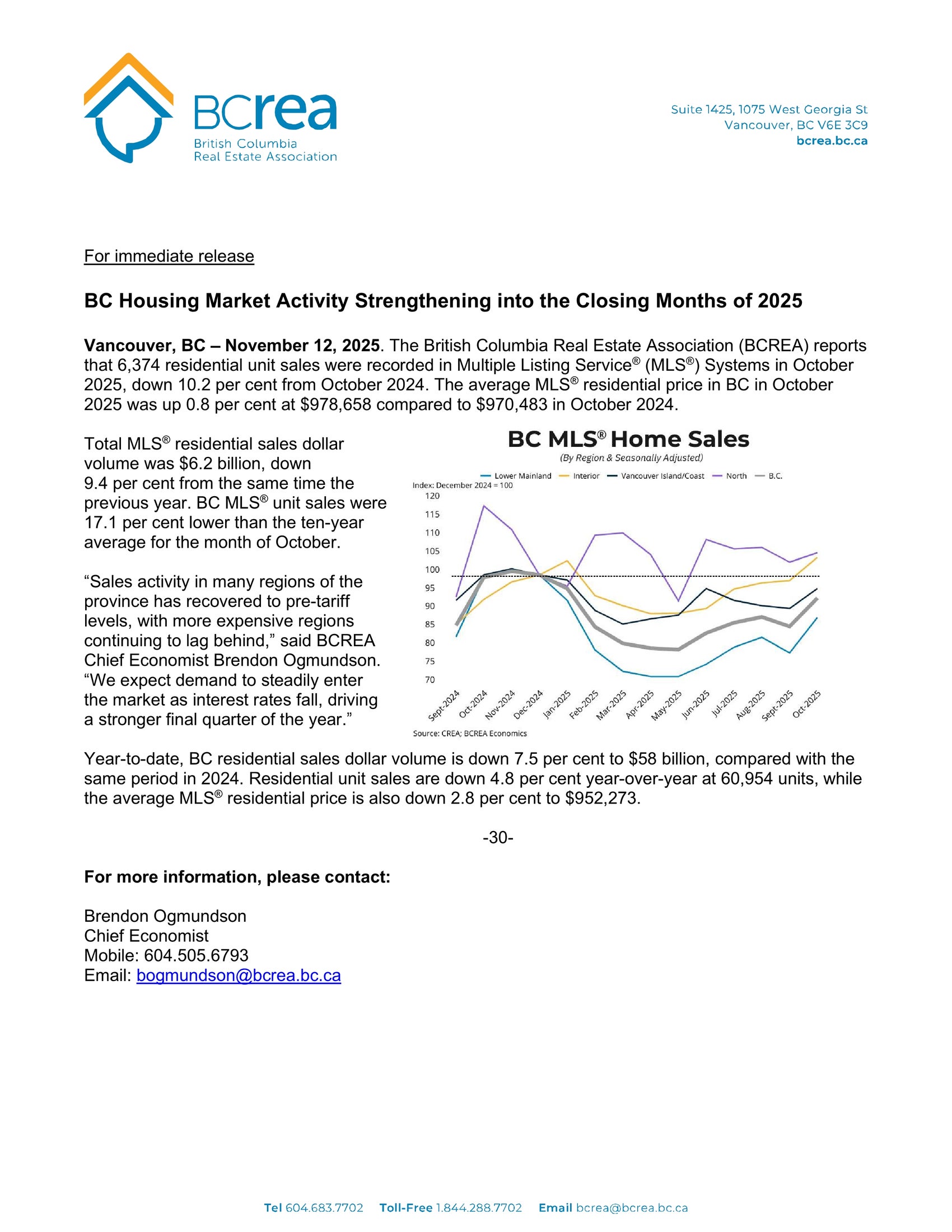 “After a brief pause in September, home sales across Canada picked back up again in October, rejoining the trend in place since April,” said Shaun Cathcart, CREAʼs Senior Economist. “With interest rates now almost in stimulative territory, housing markets are expected to continue to become more active heading into 2026, although this is likely to be tempered by ongoing economic uncertainty.”